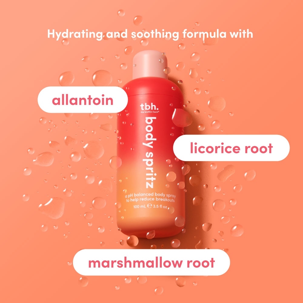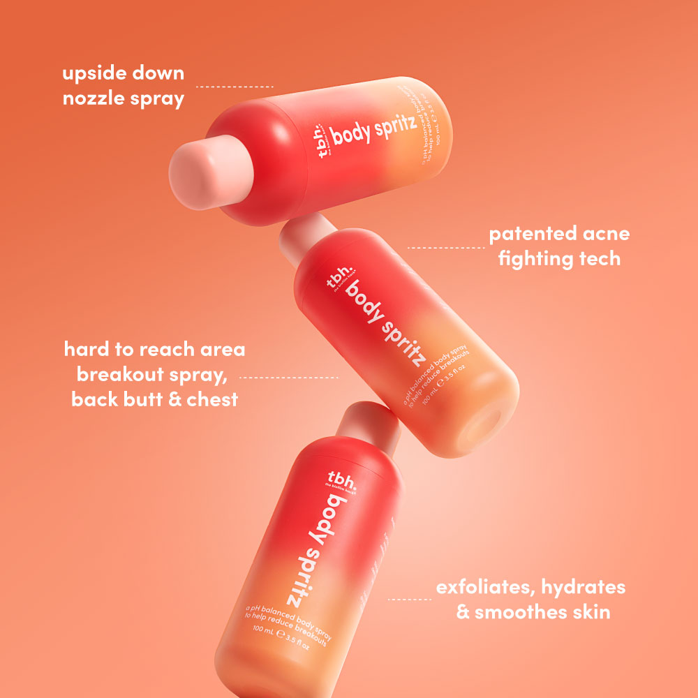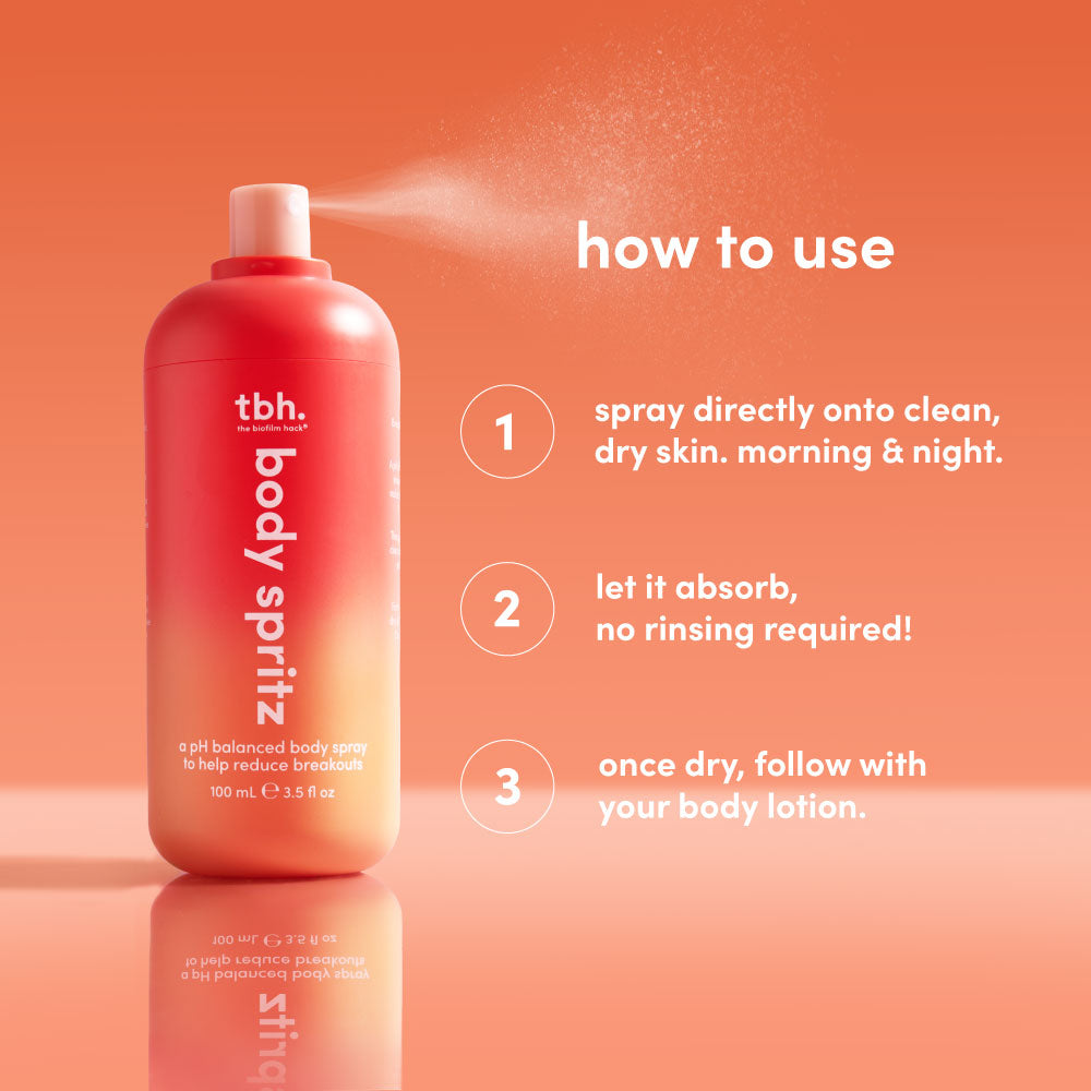 Our body spritz contains our hero patented technology to target pesky breakouts in hard-to-reach places, like your back, chest and butt.