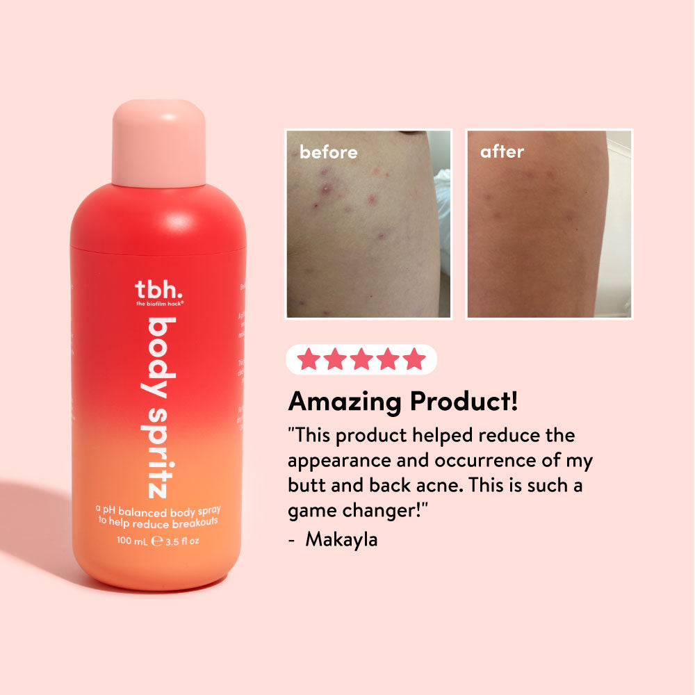 A pH - balanced body spray formulated with The Breakout Hack's hero patented technology to help fight breakouts in hard to reach places.